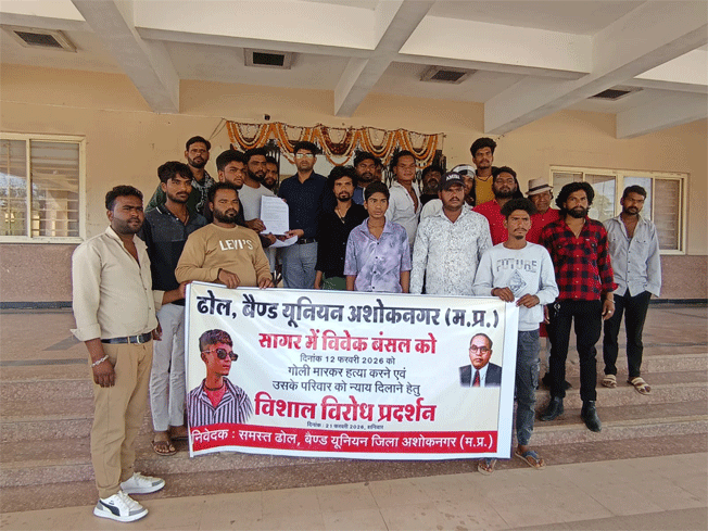 सागर में हुए विवेक बंसल पर गोली मारकर हत्या कर दी उसके विरोध में अशोकनगर में ढोल बैंड यूनियन अशोक नगर कलेक्ट पहुंचकर कलेक्टर साहब को ज्ञापन दिया उसके परिवार को नया दिलाने की मांग की।