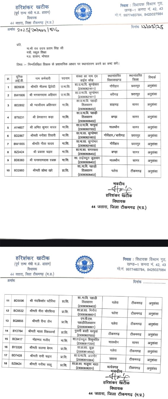 जतारा विधायक का ट्रांसफर को लेकर पत्र हुआ वायरल, दूसरीं विधानसभा के लोगों के है लेटर में नाम