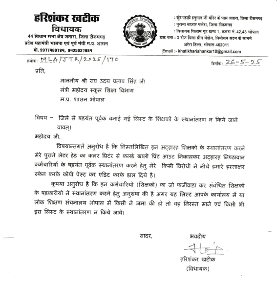 जतारा विधायक के वायरल पत्र का मामला :- विधायक हरिशंकर खटीक ने लिखा स्कूल शिक्षा मंत्री को पत्र, वायरल लेटरपेड को बताया फर्जी
