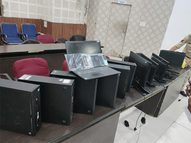 जप्त सामग्री :- 8 मोबाइल फोन सिम सहित, 8 सिम, एक लैपटॉप 6 डेस्कटॉप कंप्यूटर तथा उपकरण ।